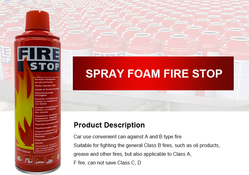 biodegradable after use without special cleaning up the scene ,a vehicle, ship-ship, family,hotels, offices, shopping malls ideal fire spare. It can be used to quickly put out such Class A and Class B fire since the beginning, you canalso put out general electrical equipment fire extinguishing distance of not less than onemeter, with rapid fire, cooling, anti resurgence properties Packaged using binary spraycans, can be full 360 degree posture injection, the drive gas is compressed air, not with thefire extinguisher spray, is consistent with the protection of the ozone layer internationalMontreal Protocol requires replacement.